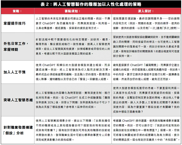 表 2:將人工智慧製作的履歷加以人性化處理的策略