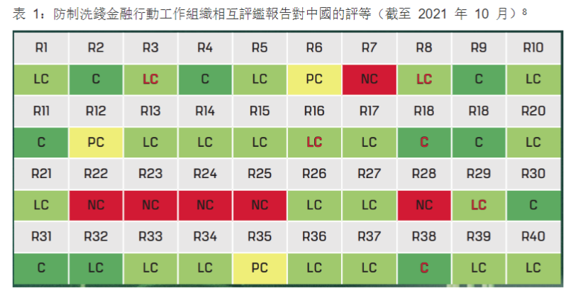 防制洗錢金融行動工作組織指出,「自2019 年對中國防制洗錢和反資助恐怖活動評估報告發布以來,中國已採取多項措施,增強其法律框架。2019 年接受相互評鑑後,中國已經在加強追蹤等級。」5 正如防制洗錢金融行動工作組織所述,第二輪加強追蹤報告(FUR) 的分析6反映了「中國對於解決相互評鑑報告(MER) 中指出涉及建議3、8、16、18、29、35 和38 的技術 法規遵循缺陷方面,已取得的進展。」7在取得足夠進展後,會考慮進行重新評鑑。預計在第三年底其接受相互評鑑報告後,中國將能妥善解決大部分技術法規遵循缺陷。